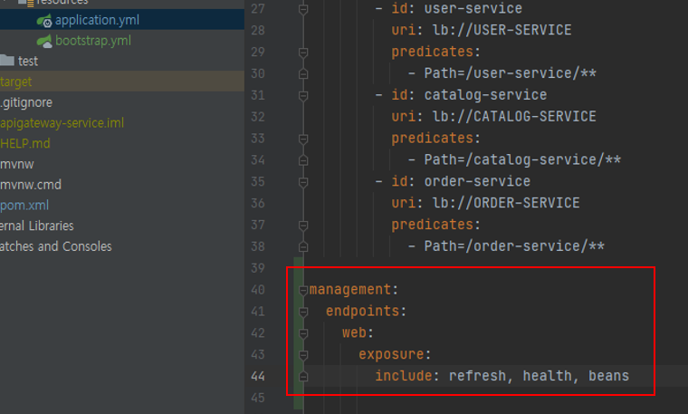 또한 내부 application.yml파일에 아래와 같은 옵션(refresh, health, beans)을 설정을 감지하고자 하는 서비스에 추가해준다. ( apigateway, user, order, catalog )